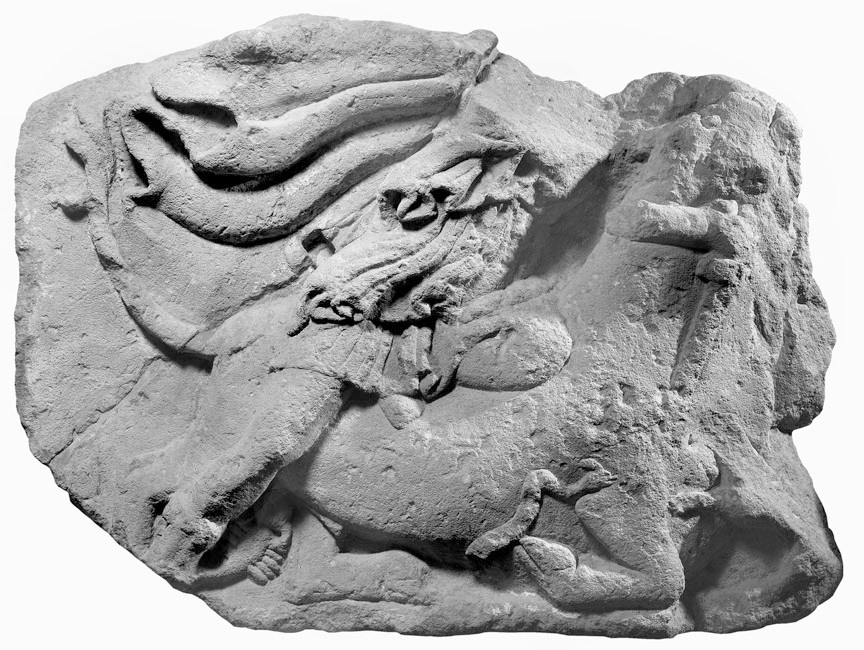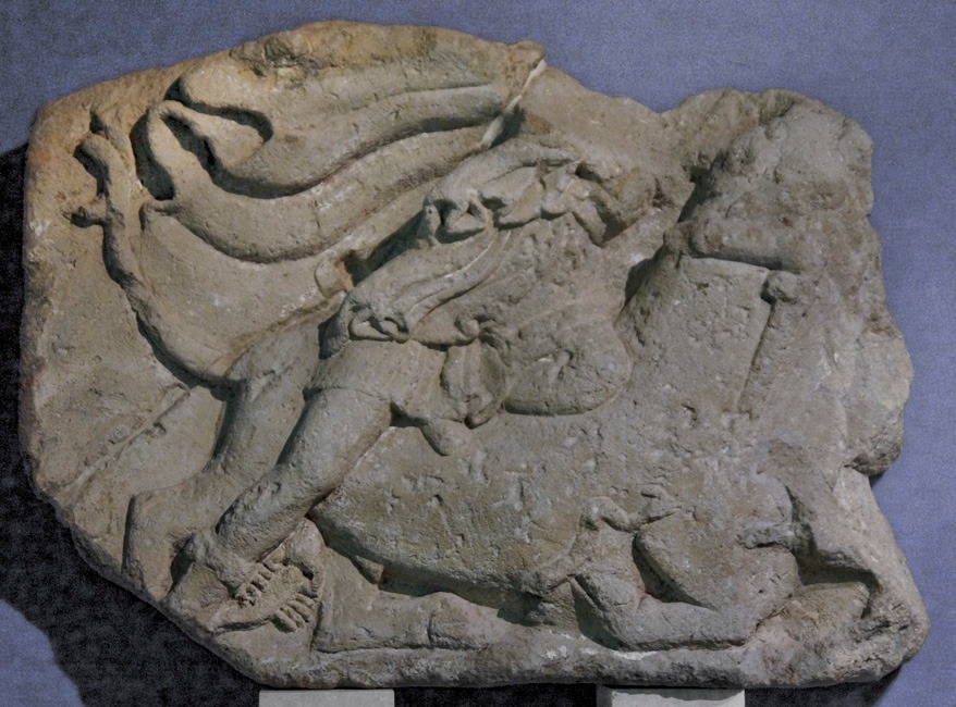 Sandstone relief of Mithras killing the bull, broken in two parts and partly restored, with dog, serpent and scorpion preserved; formerly in Vienna, now on loan to the Museum Carnuntinum.